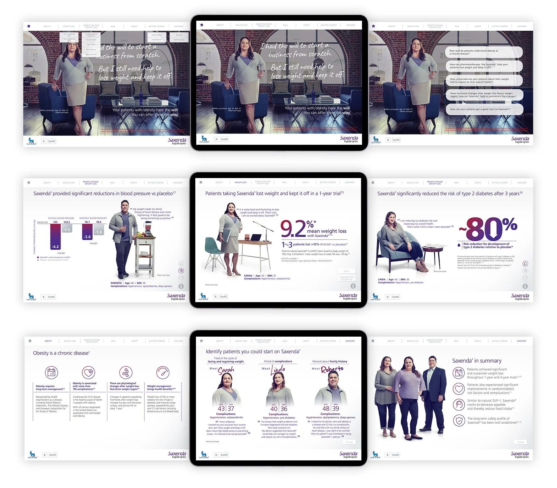 Work on the GLP-1 therapy Saxenda covered the full campaign refresh, with the goal of expressing the brand through a more contemporary, minimal design language. Branding and layouts were developed to carry Saxenda’s identity into a visual system that balances clinical credibility with an approachable feel.